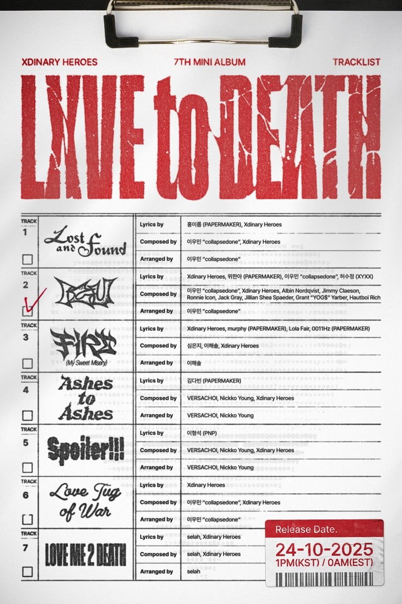 這張JYP娛樂樂團的新專輯將於10月24日美國東部時間凌晨12點/韓國時間下午1點正式發行,收錄共7首曲目,包括主打歌《ICU》以及收錄曲《Lost and Found》、《Ashes to Ashes》、《Spoiler!!!》、《Love Tug of War》、《LOVE ME 2 DEATH》和《FiRE》。一如以往,Xdinary Heroes參與了全部7首歌曲的作曲或填詞工作。