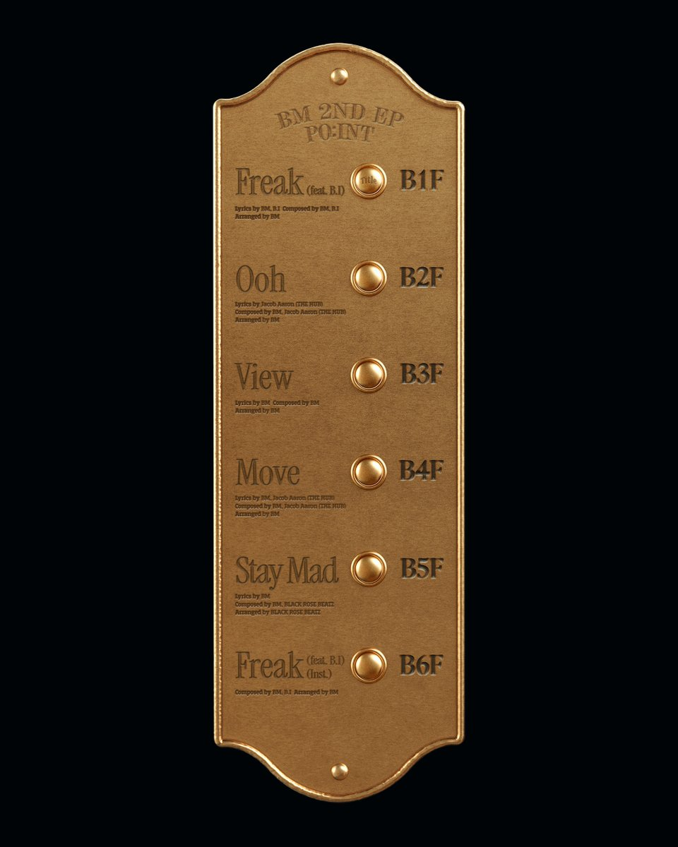 韓國時間10月11日凌晨,B.M公開新專輯曲目預告。根據最新預告,《PO:INT》共收錄5首新曲——〈Freak (feat. B.I)〉、〈Ooh〉、〈View〉、〈Move〉及〈Stay Mad〉。