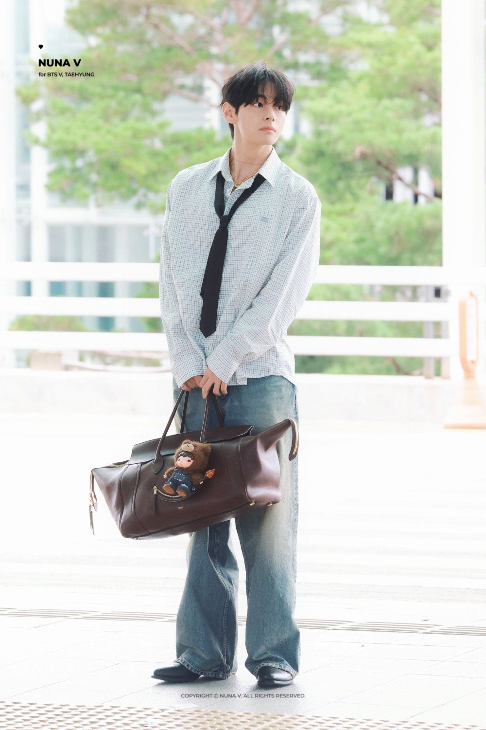 1. 10月4日:泰亨抵達巴黎時身穿休閒鈕扣襯衫搭配鬆垮黑色領帶,下身配襯水洗淺色牛仔褲。