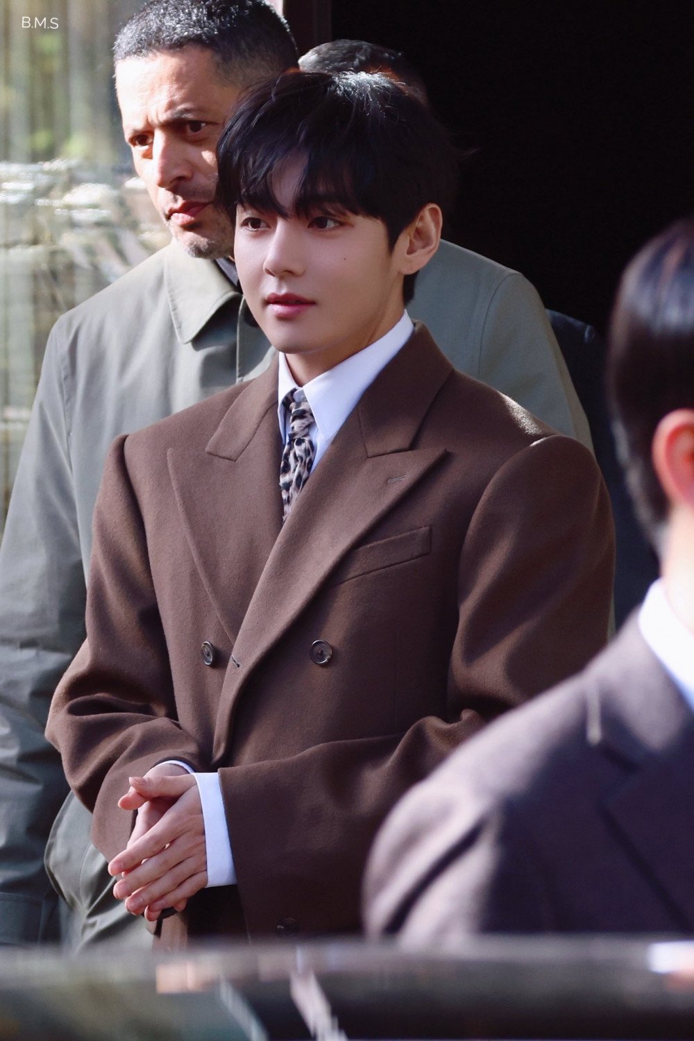 3. 10月5日主秀場上,泰亨選擇經典雋永的造型:褐色雙排扣西裝外套內搭純白正裝襯衫與豹紋領帶,盡顯優雅魅力。