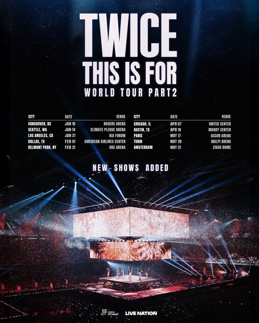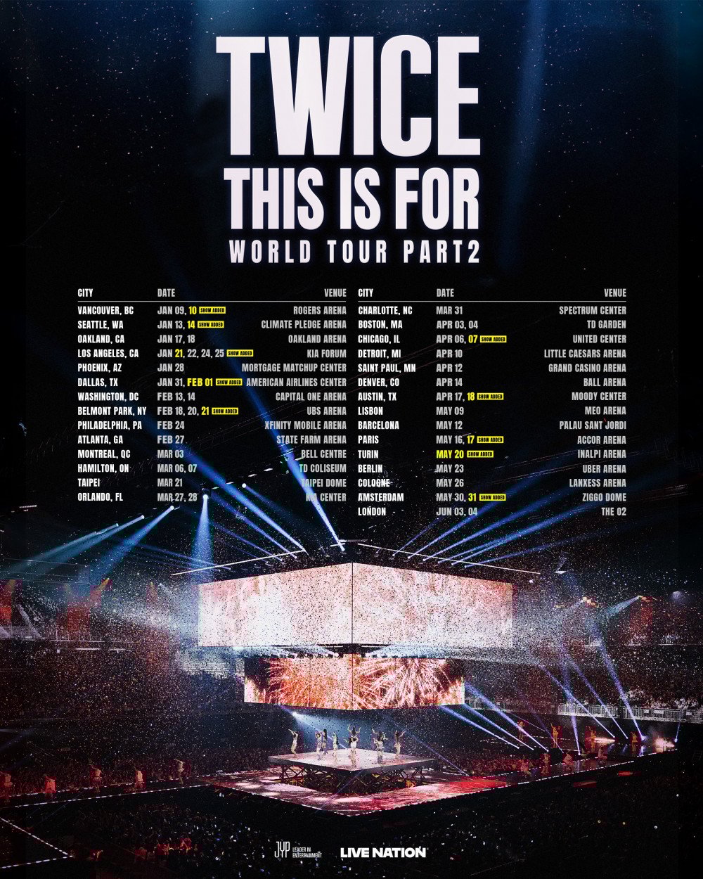 TWICE 宣布為《THIS IS FOR》世界巡演追加17場演出,回應全球樂迷的熱烈需求。新增場次包括洛杉磯Kia Forum第四場演出及義大利杜林站,並在北美、歐洲和英國增設多場表演。