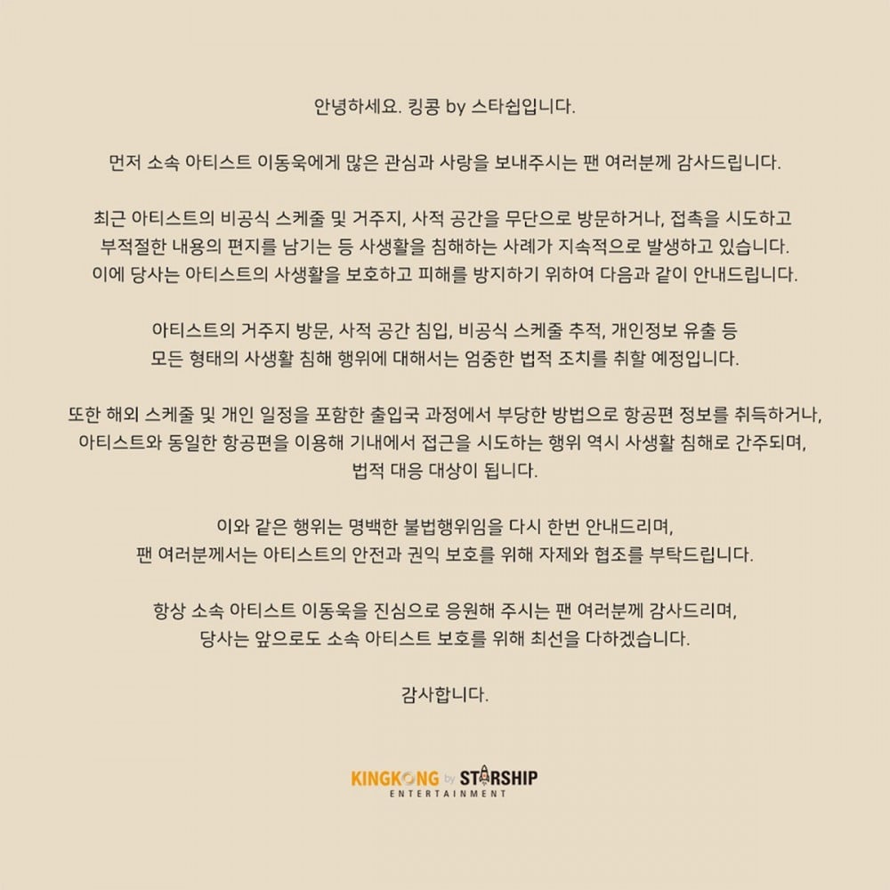 10月14日,其所屬經紀公司KINGKONG by Starship Entertainment發表官方聲明指出:「近期發生多起未經許可前往李棟旭住所及私人空間、試圖接觸或留下不當信件等行為,這些皆屬明顯侵犯私生活之舉措。」