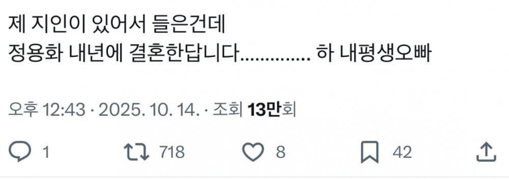 一名SNS用戶寫道:「我的熟人聽說鄭容和明年要結婚了............哈,我的一輩子歐巴。」