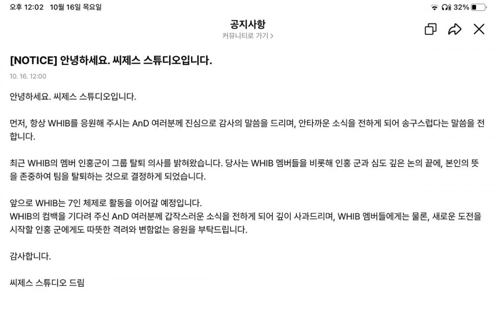 公司聲明中表示: 「首先向一直給予支持的AnD(WHIB官方粉絲名)表達衷心感謝。在此遺憾地向大家傳達令人惋惜的消息——成員仁弘已表達退出組合的意願。」