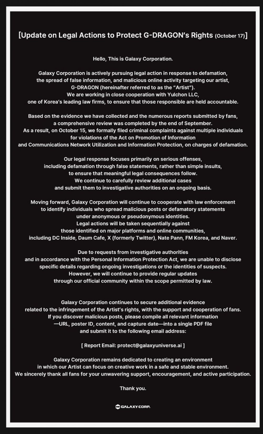韓國時間10月17日,G-Dragon所屬經紀公司Galaxy Corporation就針對該藝人的網路誹謗及惡意行為發布法律行動最新進展。