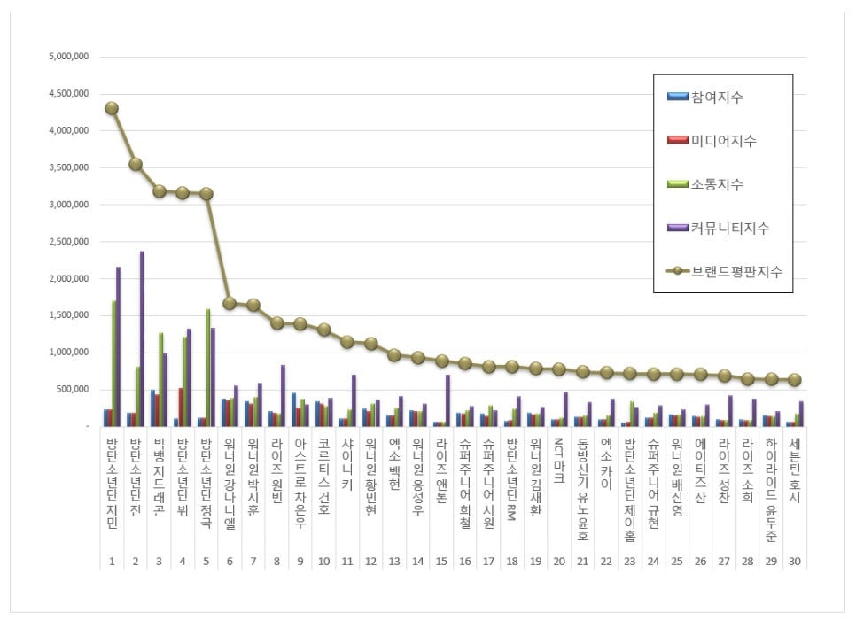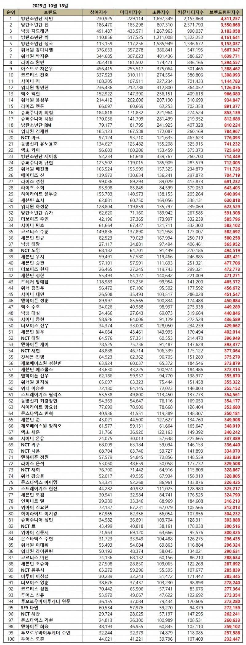 韓國時間9月18日至10月18日期間,研究所針對755位現役男團偶像的大數據進行分析,涵蓋消費者參與度、媒體活躍度、傳播力及社群活躍度等範疇。根據分析結果,男團偶像個人品牌價值榜首為防彈少年團Jimin,其後依序為同團成員Jin、BIGBANG成員G-Dragon等。下列為各偶像獲得的品牌價值指數: