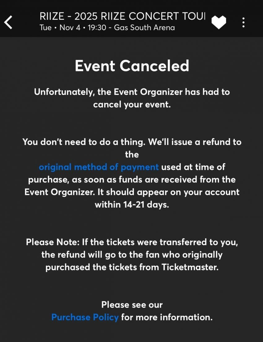 消息令眾多粉絲震驚。RIIZE原定於兩週後(11月4日)舉辦演唱會,但SM娛樂於10月18日無預警取消演出,未發布任何官方公告或解釋。粉絲隨即發現RIIZE巡演門票銷售情況欠佳,喬治亞站及其他場次仍有大量座位未售出。