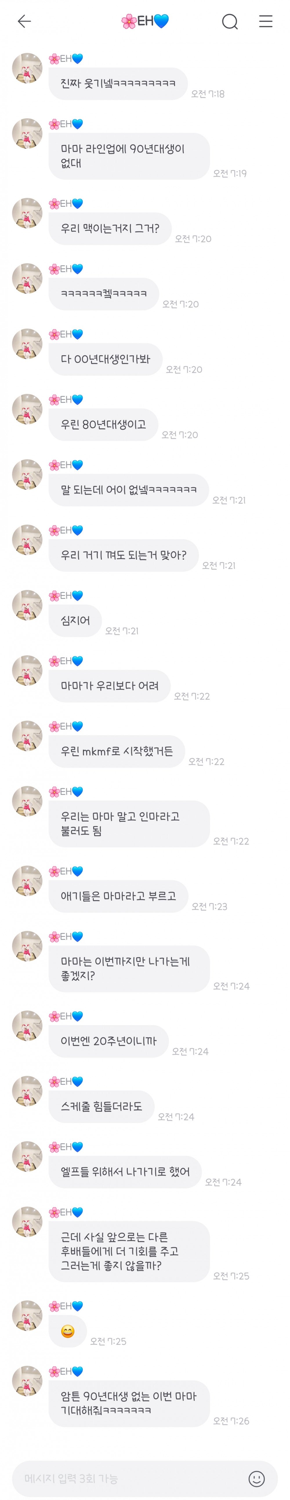 「這太好笑了 lol 聽說MAMA陣容幾乎沒有90系偶像,根本是在打我們臉吧?Lol 現在全是00系了。我們(Super Junior和E.L.F)是80系,真的有資格出席嗎?更好笑的是我們比MAMA還年長。當初這頒獎禮叫mkmf——那是我們的起點。與其叫MAMA,我們才該稱這頒獎禮為BABIES,真正的寶寶們才該叫它MAMA。