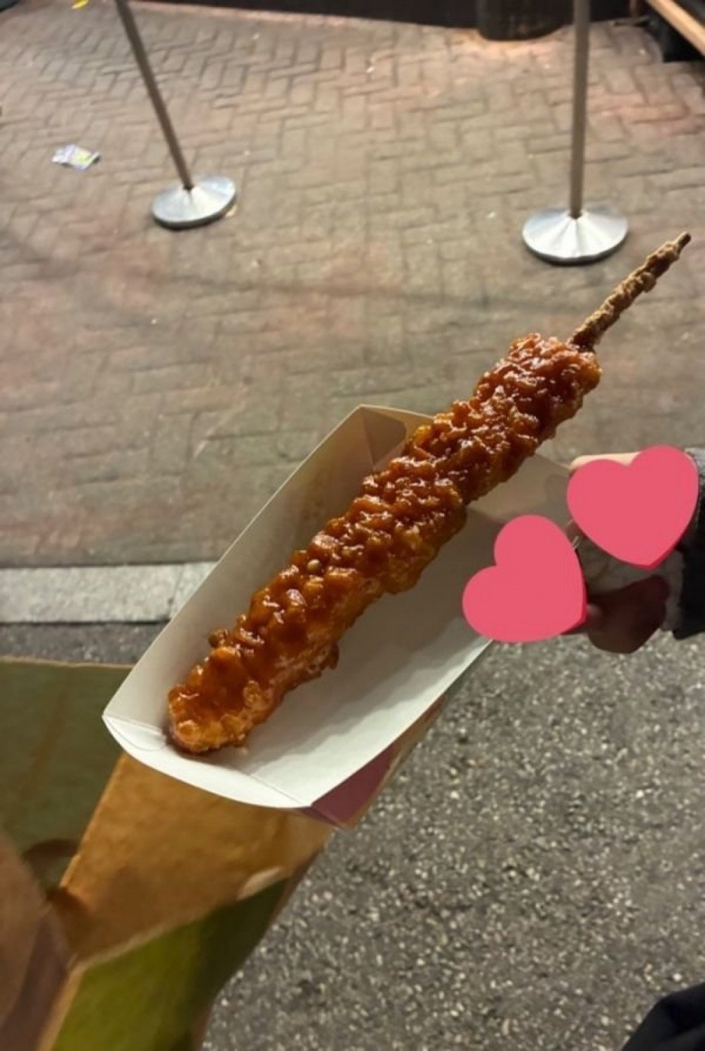 「我朋友在愛寶樂園遇到KickFlip,當他們告訴周王自己的朋友是粉絲時,他不但道謝還遞出一串魚糕(熱狗棒)才離開。」