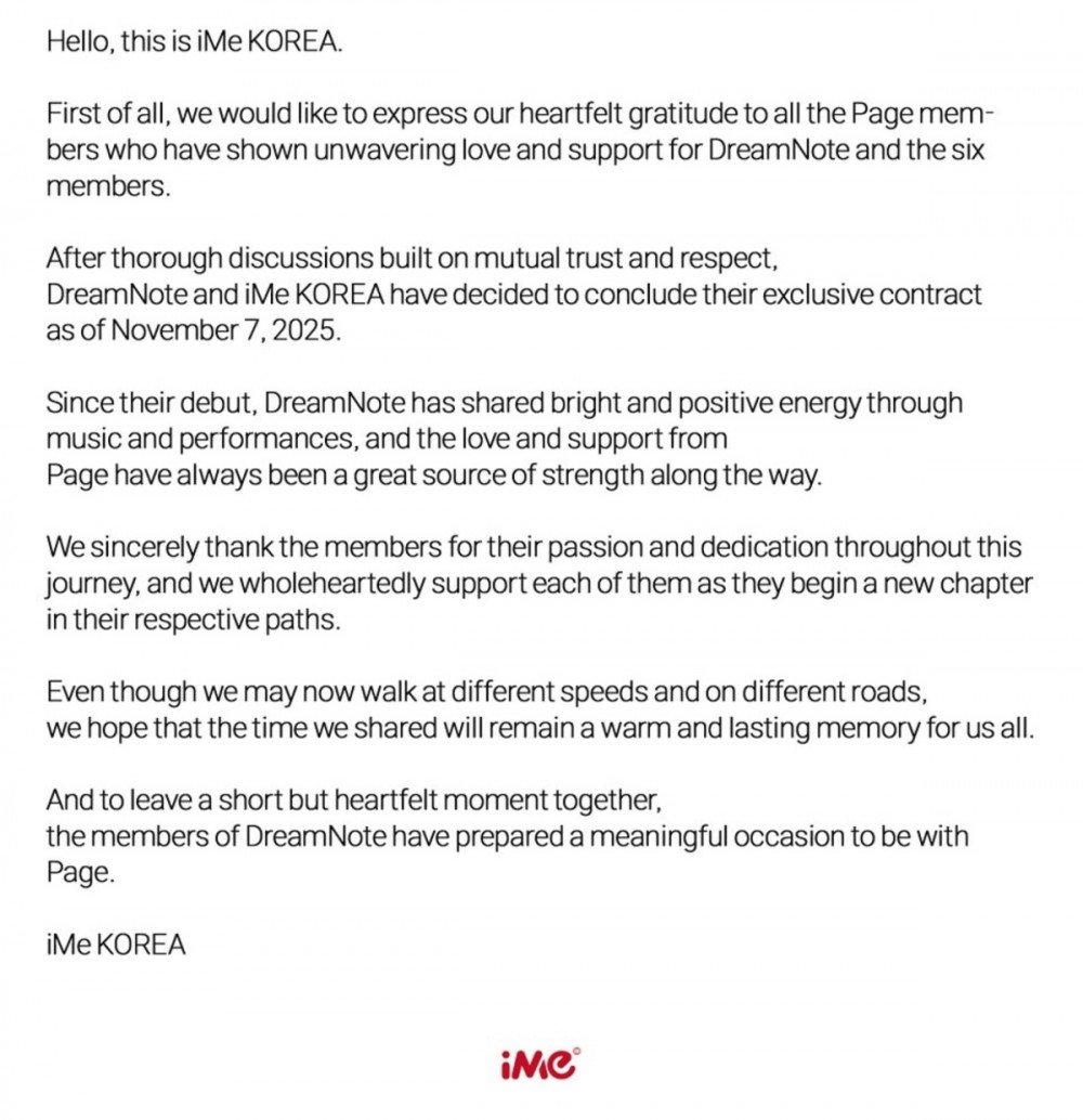 10月22日,iMe KOREA 發表官方聲明確認DreamNote合約將於2025年11月7日終止。合約期滿後,成員們將「開啟各自人生的新篇章」並「以不同步伐踏上相異的道路」。
