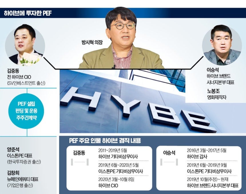 另據投資銀行界內部人士指認,金中東是這宗億萬利潤計劃的關鍵人物。2019年,金中東、房時爀等人以「公司無上市計劃」為由,脅迫Big Hit Entertainment股東出售持股,並透過金中東設立的私募基金獲取大量股權。待HYBE於2020年上市後,他們拋售約9.16%股份,總計牟利3.6兆韓元(約2.5億美元)。其中金中東個人被指獲利約1,000億韓元(約7000萬美元)。此前有報導稱房時爀透過此計劃單獨獲利約1.9兆韓元(約1.32億美元)。