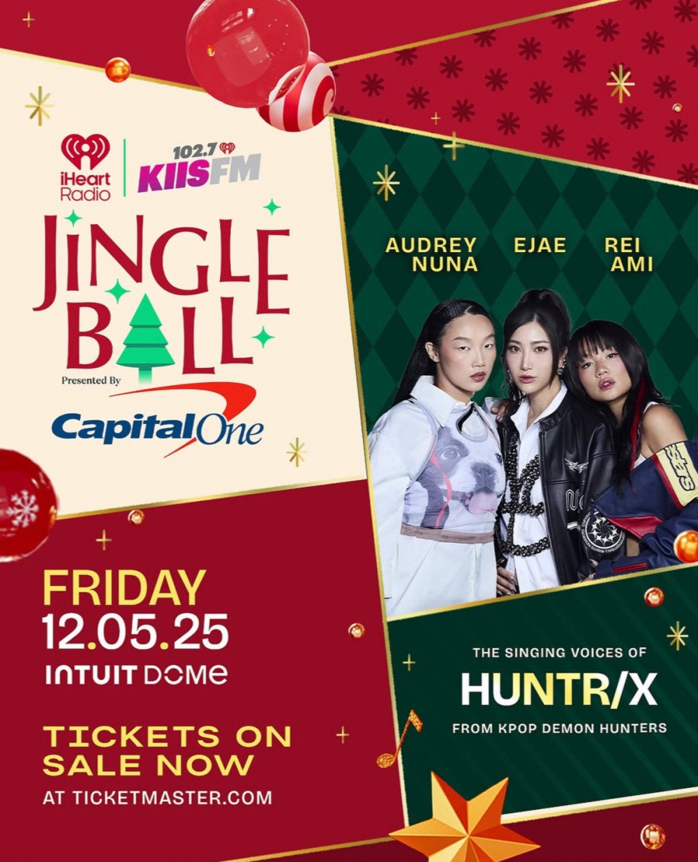 當地時間10月22日,iHeartRadio正式宣布HUNTR/X成員Ejae、Audrey Nuna與Rei Ami將於12月5日登上「JINGLE BALL」演唱會舞台。