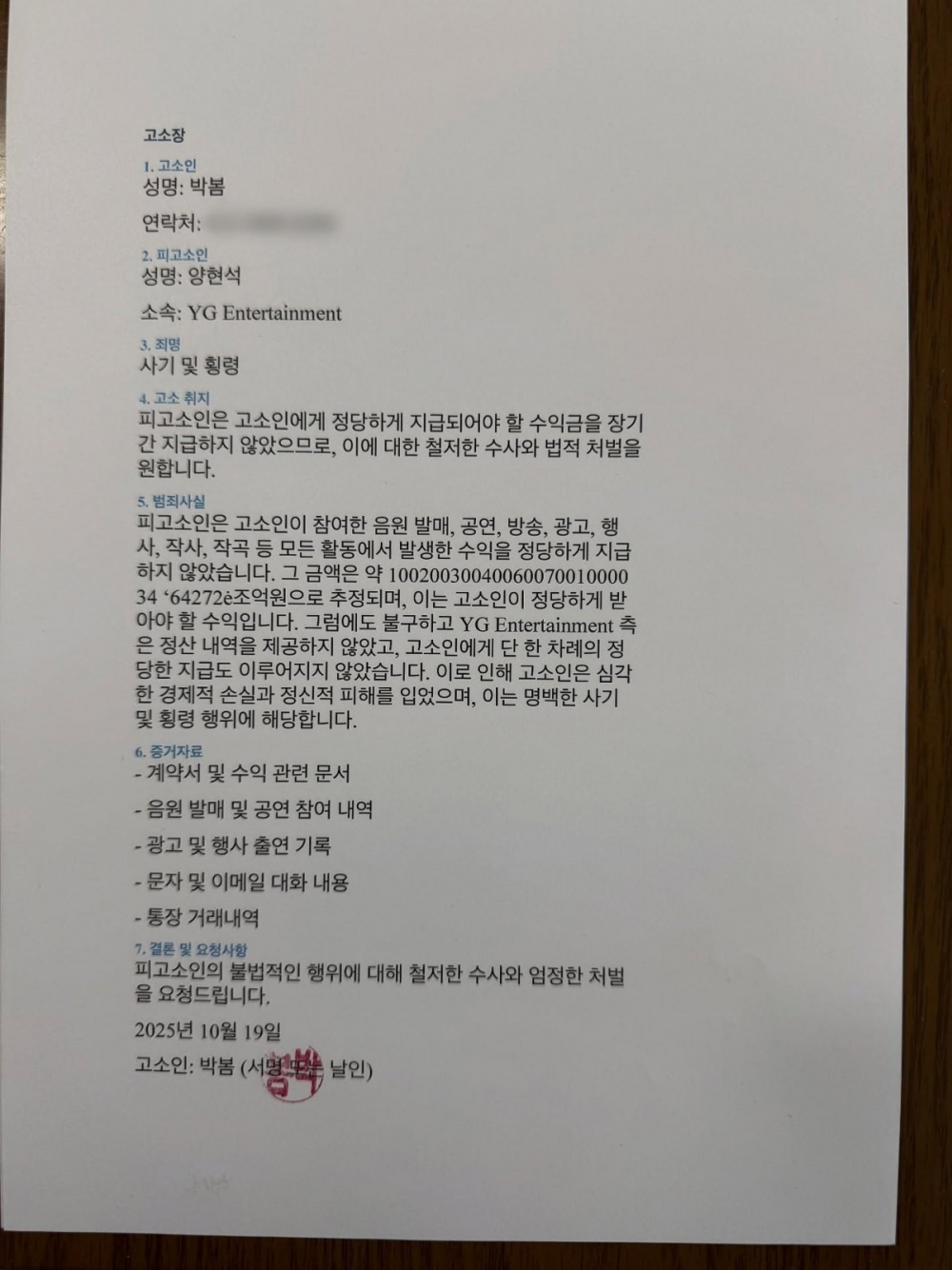 稍早於10月22日,朴春在社交帳號上傳疑似對楊賢碩的訴訟文件照片,配文寫道「來自朴春」。照片中原告欄位標註「Park Bom」,被告欄位則列明「Yang Hyun Suk」,案由項目記載為「詐騙與侵佔罪」。