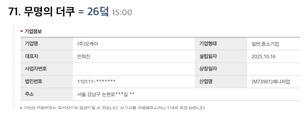該公司已於10月16日正式完成登記,業務範圍包括藝人經紀、音樂及專輯製作與發行、演出及活動策劃。 此舉標誌著閔熙珍在2024年11月離開ADOR約一年後,似乎即將重返娛樂圈。