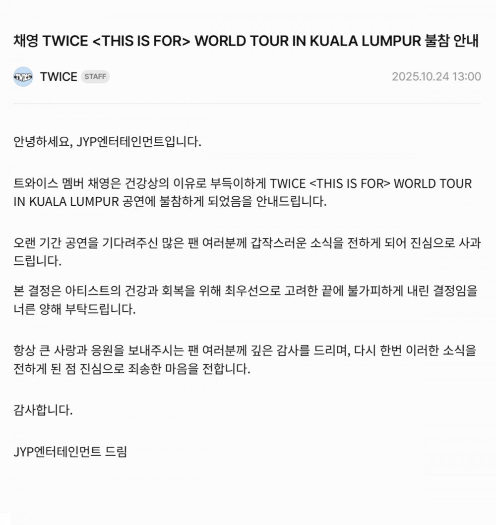 JYP娛樂 正式宣布,TWICE成員彩瑛將不會參與團體即將在吉隆坡舉行的世界巡迴演唱會。該場演出定於2025年10月25日在國家曲棍球體育場舉行。