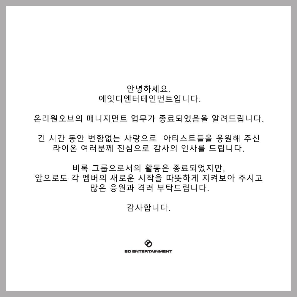 韓國時間10月31日,8D Entertainment宣布OnlyOneOf團體活動正式畫下句點。
