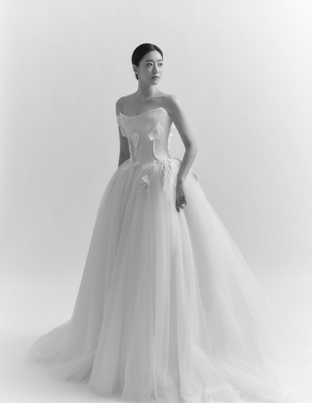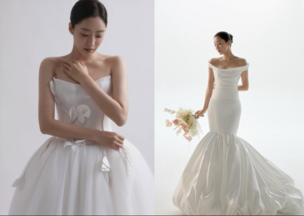 其他畫報畫面充分展現了咸𤨒晶的多樣魅力。其中一張她身著米色調細肩帶禮服展現時尚幹練風範,另一張則以純白婚紗搭配整潔髮型,彰顯清純優雅氣質。