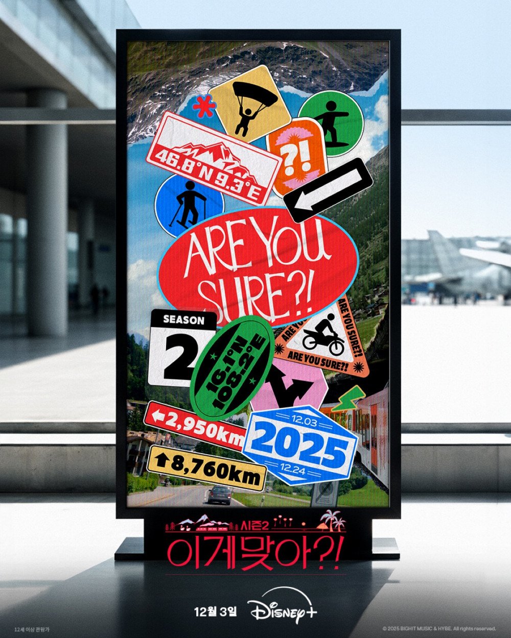 韓國時間11月5日上午9點,BTS官方社群平台公開Disney+原創系列《Are You Sure?!》第二季預告海報,記錄智旻與柾國充滿變數的友誼冒險。新一季距離2023年9月完結並獲全球熱烈迴響的第一季,時隔約一年三個月。