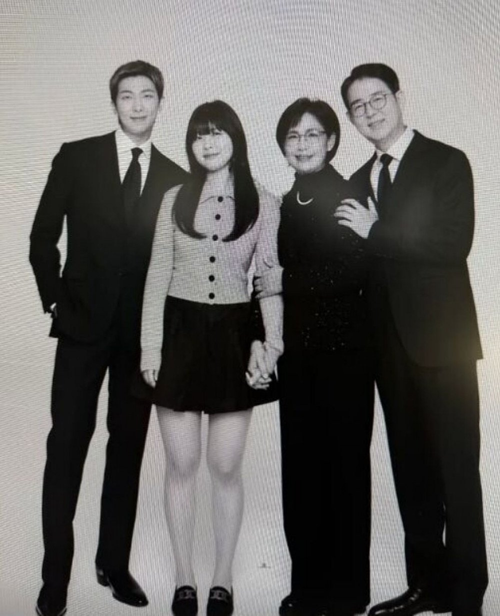 照片中RM與父母及妹妹並肩而立,全家皆以筆挺西裝造型亮相。RM俊秀五官與修長身型與父親如出一轍。另一張照片中,全家換上同款運動套裝,整齊劃一地拉上外套拉鍊。柔和神情與統一服飾,完美演繹幸福和樂的家庭氛圍。