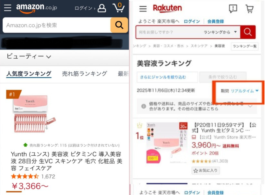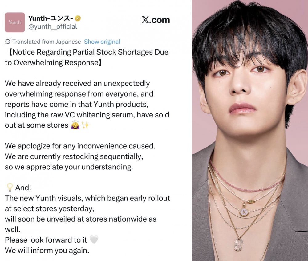 V的宣傳照開始在日本精選門店亮相後,立即引發粉絲搶購熱潮。Yunth維他命C精華更登上日本亞馬遜與樂天的銷售排行榜首位。