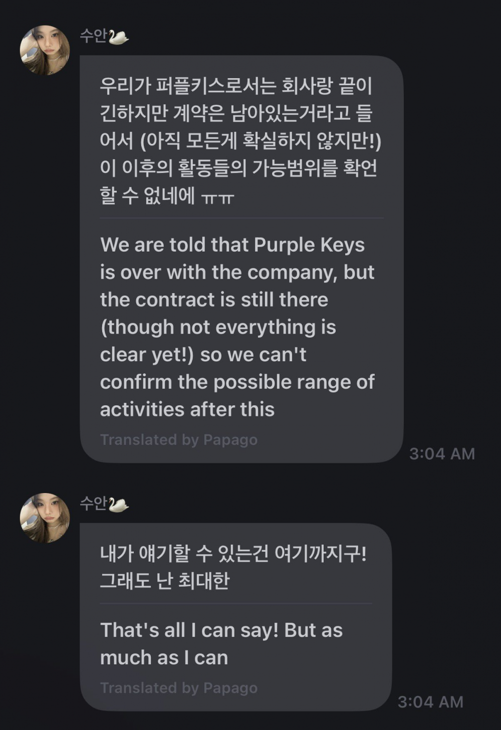 然而更令人訝異的後續隨即曝光。11月8日,PURPLE KISS成員Swan透露成員們未來並不能如外界預期般自由開展個人演藝事業。她說明儘管團體提前解散,成員與RBW娛樂的個人合約仍持續生效至2028年3月——這意味著即使公司未為成員規劃任何活動,未來3年內成員仍被綁定在所屬社。Swan對此情況表示困惑。