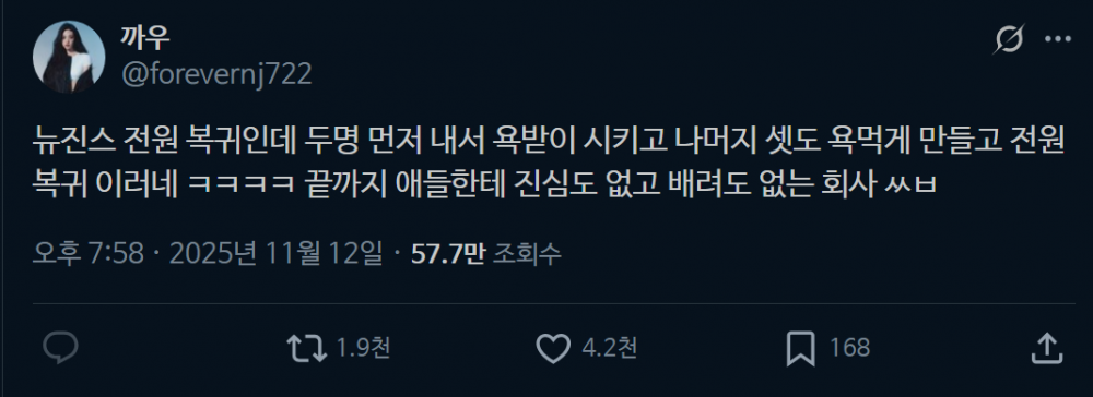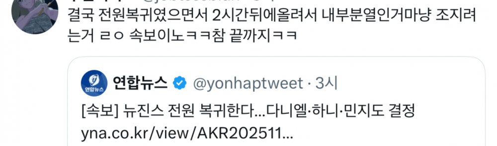 「全體NewJeans成員本就打算回歸,但ADOR刻意先讓2人出面承受『選擇回歸』的罵聲,另外3人則背負『不願回歸』的指責。直到輿論發酵後才宣布5人全數回歸。這間公司對這些女孩毫無誠意與體恤」