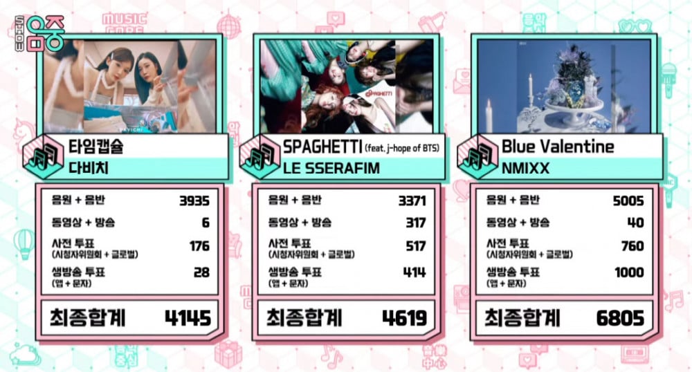 最終由NMIXX以總分6,805分奪得冠軍,這是她們憑藉〈Blue Valentine〉獲得的第五個音樂節目冠軍,再創里程碑。