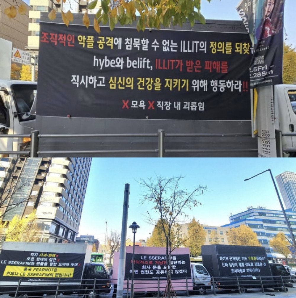 11月20日,粉絲聚集在首爾龍山區HYBE總部門前,透過卡車標語呼籲公司應保護旗下團體並採取行動抵制網路霸凌。