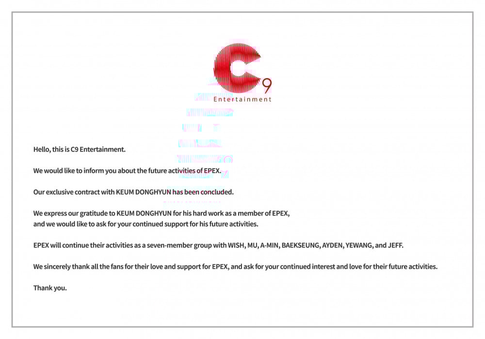 11月21日,EPEX所屬社C9 Entertainment宣布與琴洞弦的專屬合約已終止,他將退出組合。此後EPEX將以七人體制繼續活動。