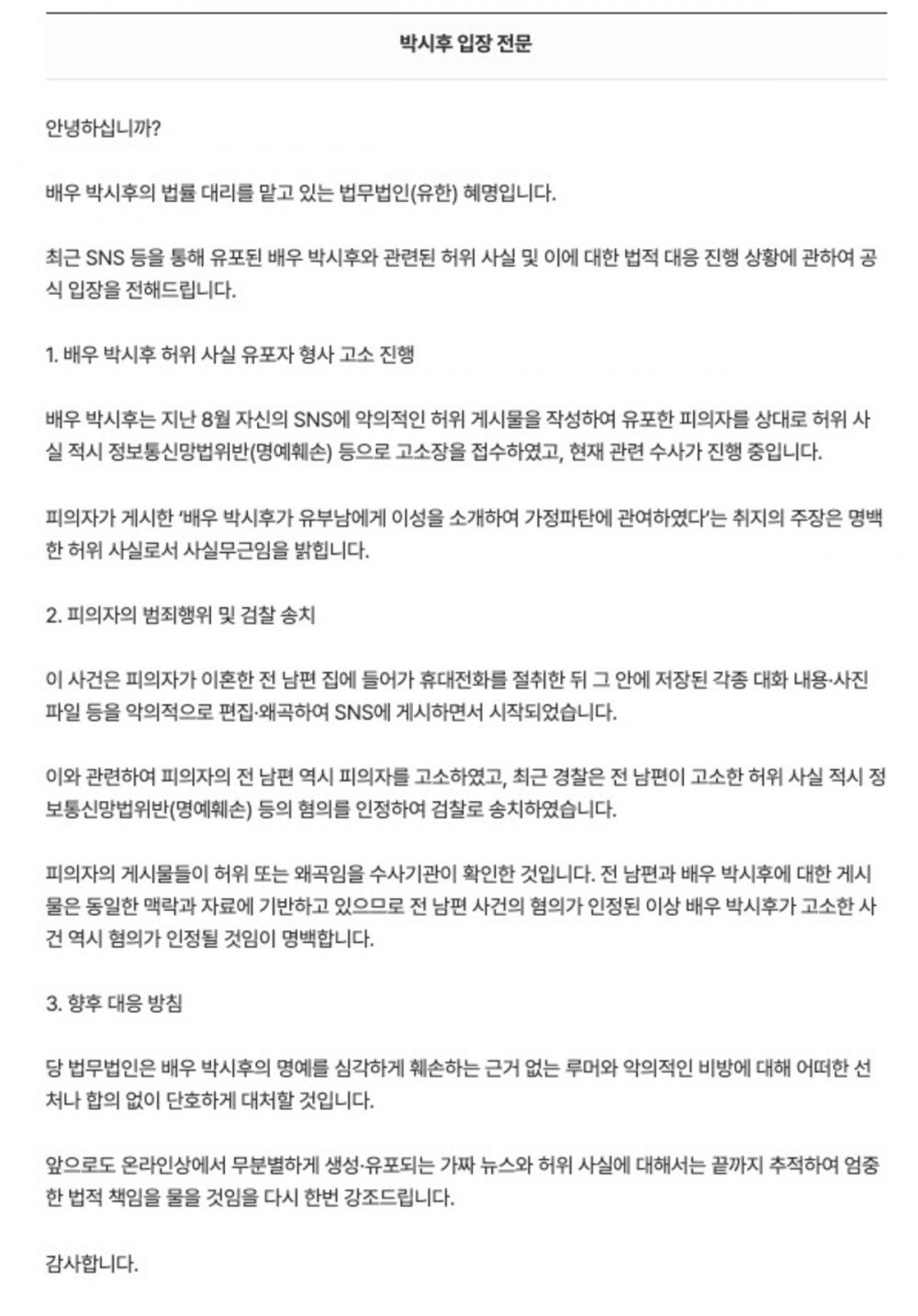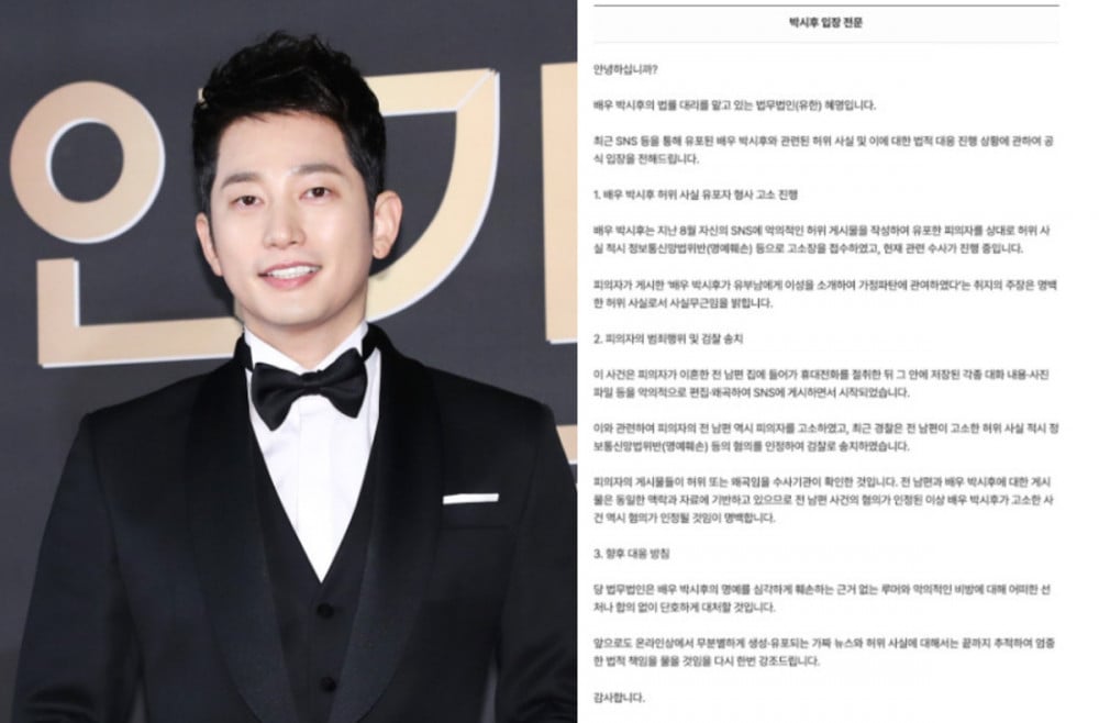 11月21日,朴施厚的法律代表慧明律師事務所發表正式聲明稱:「針對近期社交媒體上流傳關於演員朴施厚的不實資訊及現行法律程序,特此作出正式說明。今年八月,朴施厚先生已對在其社交平台撰寫並散佈惡意虛假帖文的嫌疑人提起刑事控告,該控告包含依據《信息通信網法》對散佈虛假資訊構成誹謗的指控,目前調查正在進行中。」