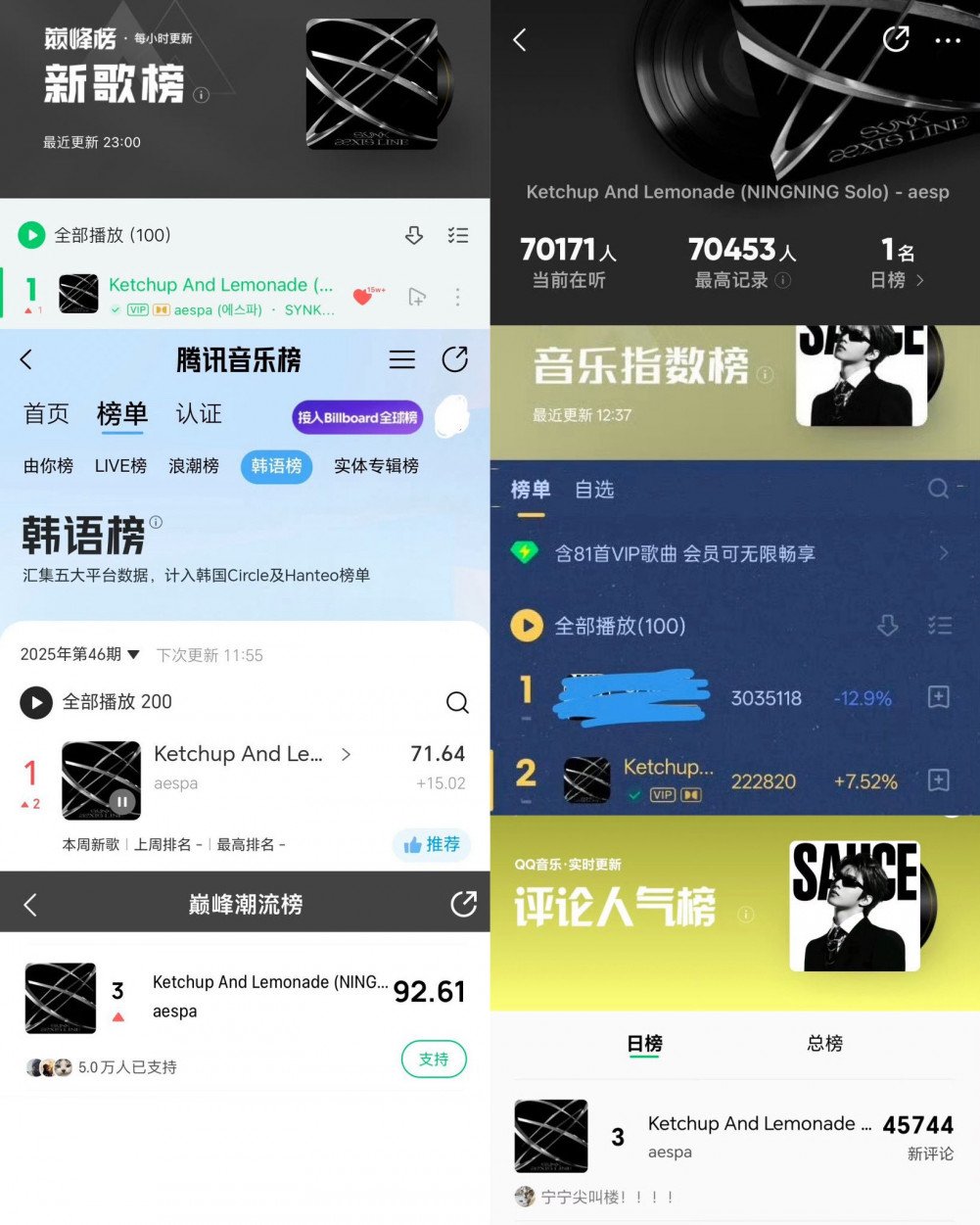 在2025年11月20日的榜單更新中,《Ketchup and Lemonade》正式以第一名之姿進榜。NINGNING成為當週唯一空降榜首的藝人,超越眾多其他K-POP新發行作品。