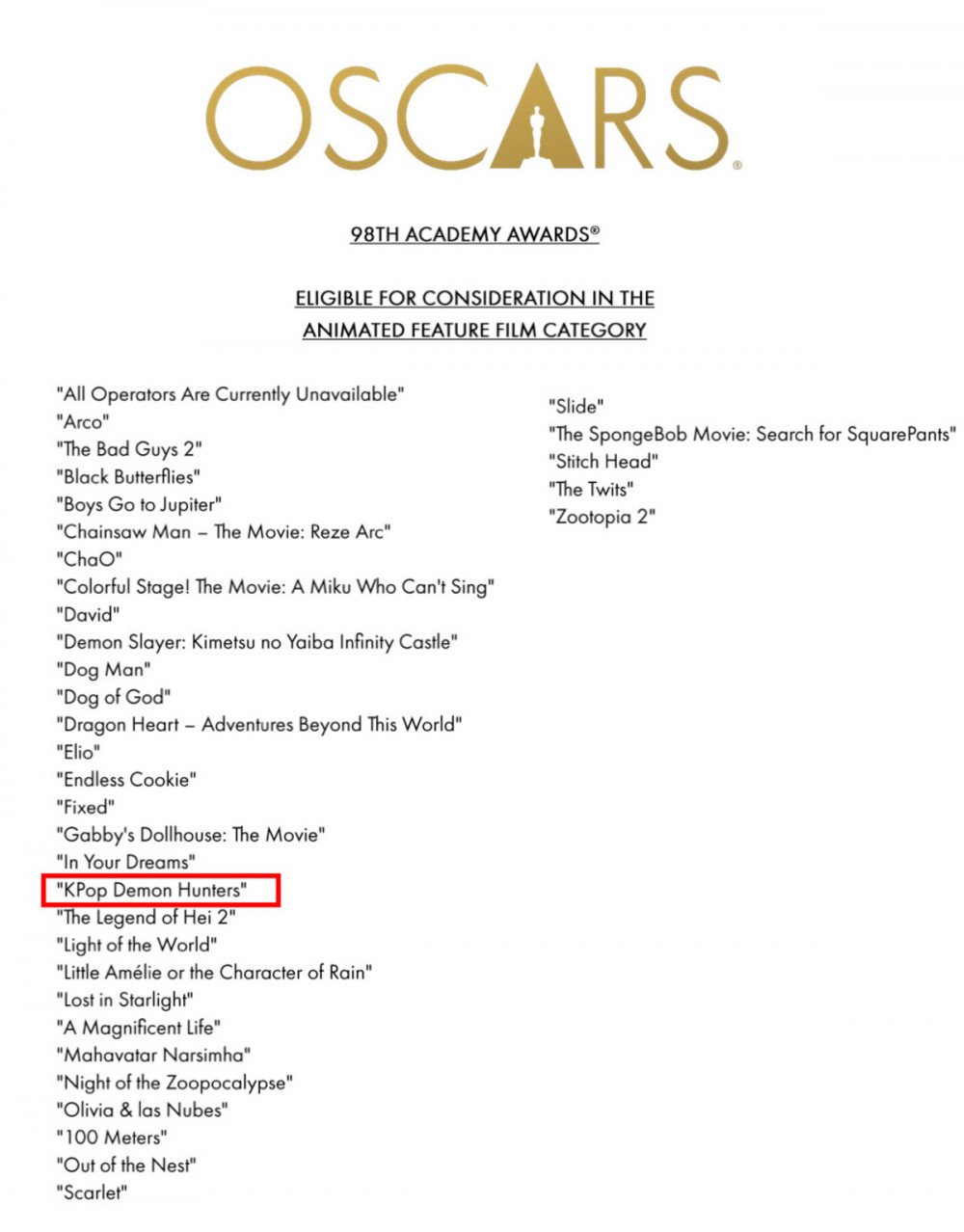 當地時間11月21日,美國電影藝術與科學學院(AMPAS)公布符合「第98屆奧斯卡金像獎」最佳動畫長片類別評審資格的電影名單,共計35部作品完成登記。