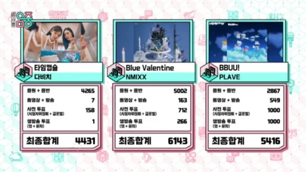 本週一位候補為Davichi《TIME CAPSULE》、NMIXX《Blue Valentine》及PLAVE《BBUU!》。NMIXX以總分6143分勝出,PLAVE 以5416分居次,Davichi則以4431分位列第三。