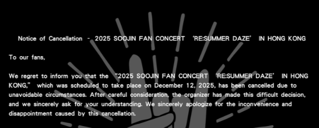 其後,Soojin預定12月12日在香港的演唱會同樣以「不可抗力因素」為由取消。