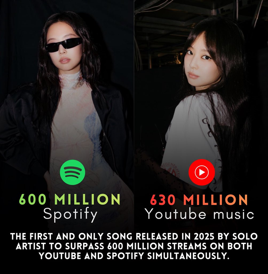 同樣情況出現在YouTube Music,使《Like JENNIE》成為「2025年首支且唯一同時在YouTube Music與Spotify突破6億串流量的個人歌手作品」。