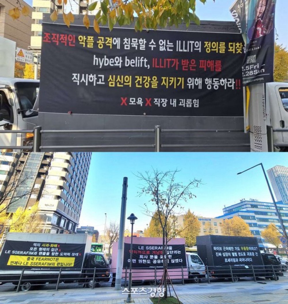 11月20日,兩團粉絲在HYBE龍山總部前舉行卡車抗議,批評NewJeans回歸計劃,同時要求公司加強對本命團的保護與反騷擾措施。
