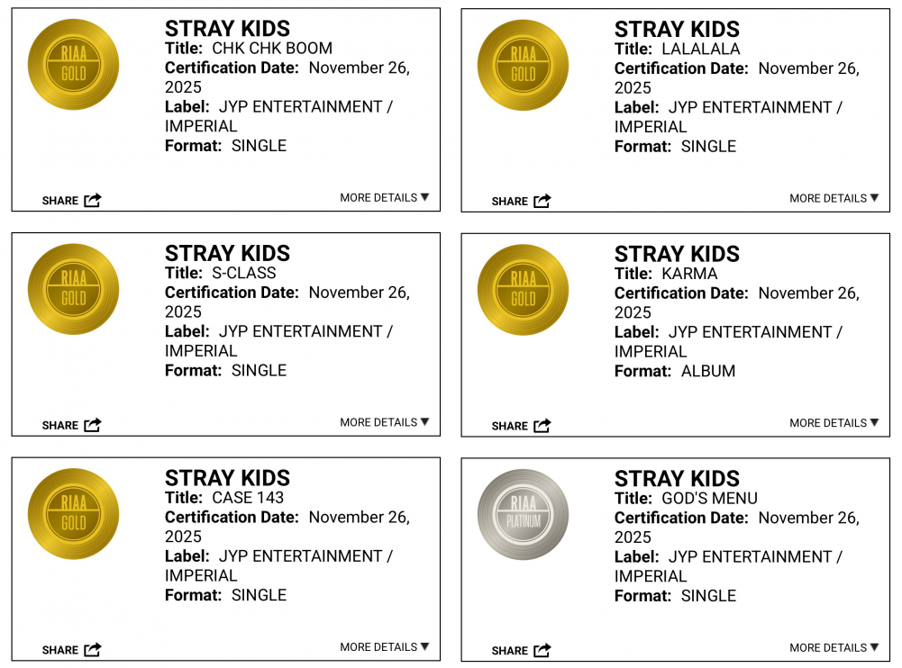 Stray Kids在美國市場持續創下空前佳績,正式成為第四代K-Pop團體中首組獲得14項RIAA認證的藝人,包括6張專輯認證及8首單曲認證。此里程碑進一步鞏固他們在美國音樂產業中最成功韓國藝人之一的地位。