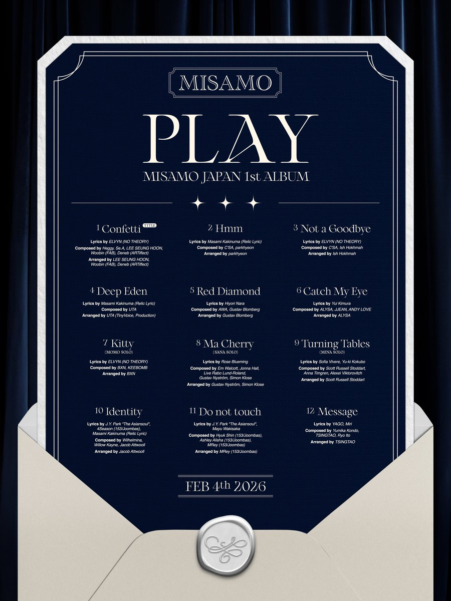 MISAMO同時公開新專輯完整曲目表,《PLAY》共收錄12首歌曲,包含3首成員個人單曲。