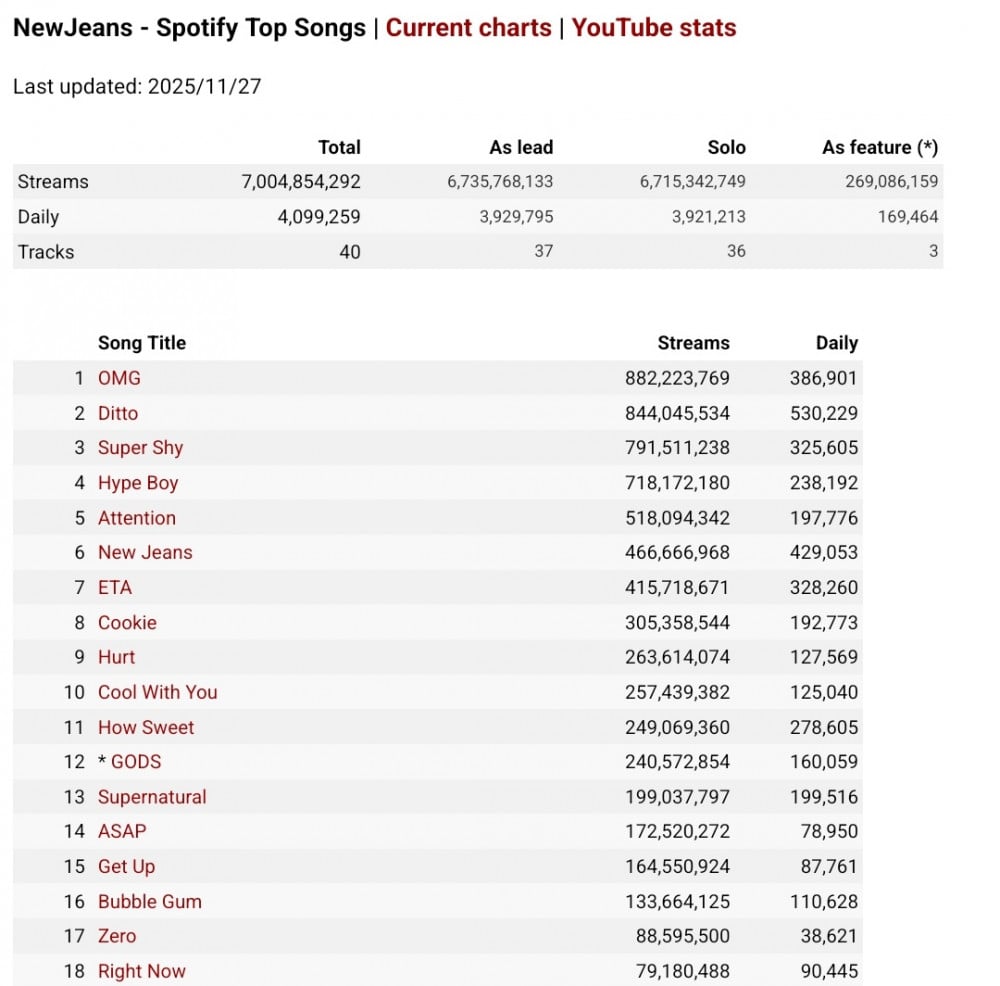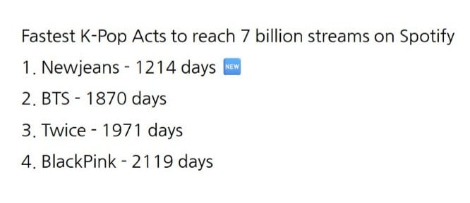 隨著 NewJeans 成為最快達成 70億串流收聽的 K-POP 團體,目前排名依序為 BTS(第2位)、TWICE(第3位)及 BLACKPINK(第4位)。