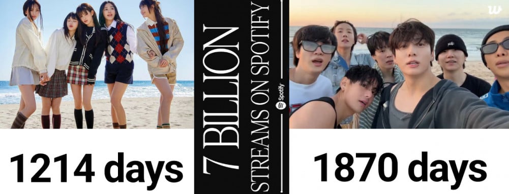 此次 NewJeans 正式超越 BTS 的紀錄,以 1214 天成為最快在 Spotify 達成 70億串流收聽的 K-POP 團體,打破 BTS 原先保持的 1870 天紀錄。