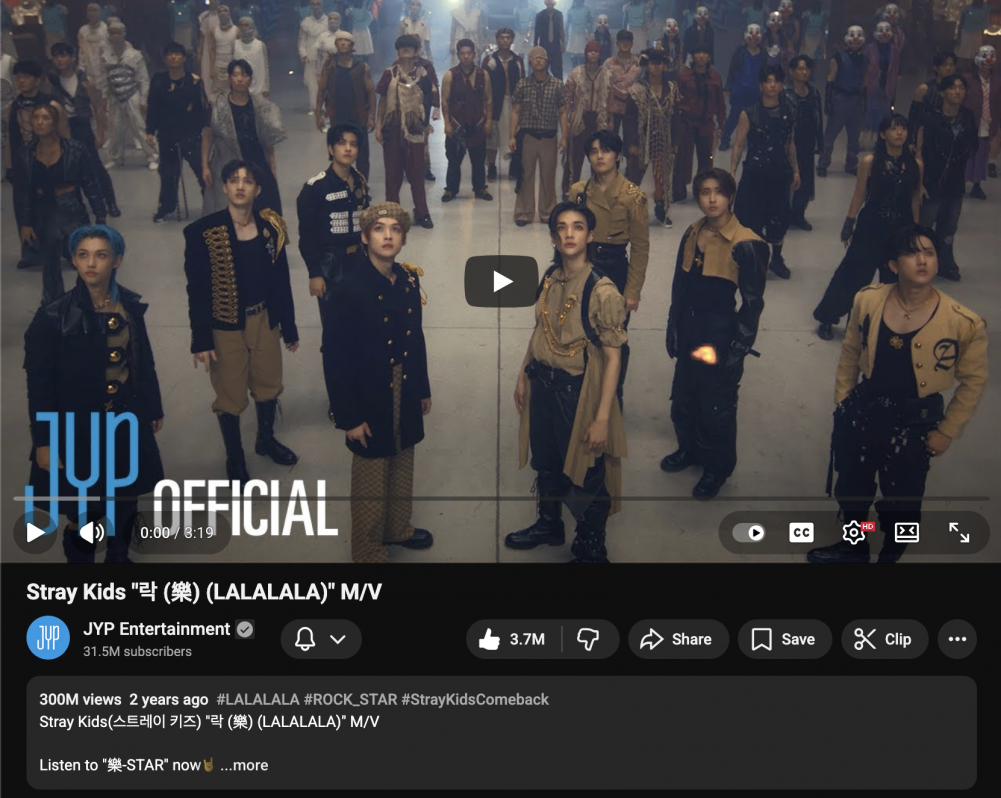 這首融合搖滾元素的主打歌僅用748天便達成3億觀看,成為Stray Kids第三快達標的MV。此成就讓Stray Kids持續穩坐唯一擁有300萬點擊MV的第四代男團寶座,同時也是YouTube平台擁有最多3億點擊MV的第四代團體。