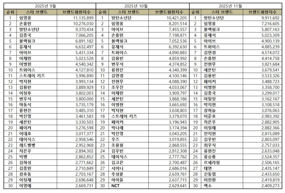 根據韓國品牌聲譽指數顯示,BTS、林英雄與BLACKPINK成為11月份品牌價值最高的頂級明星。
