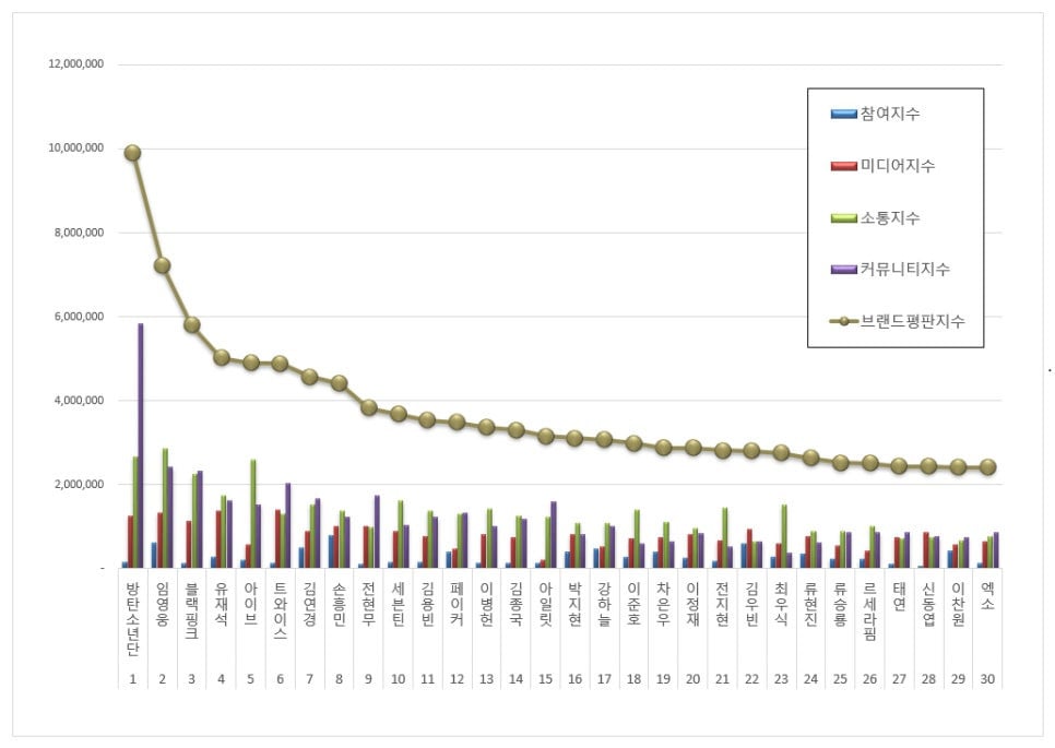 其中BTS以9,911,692品牌積分連續兩個月蟬聯冠軍,林英雄則以7,216,605分緊隨其後。BLACKPINK以5,807,163總積分位居第三。