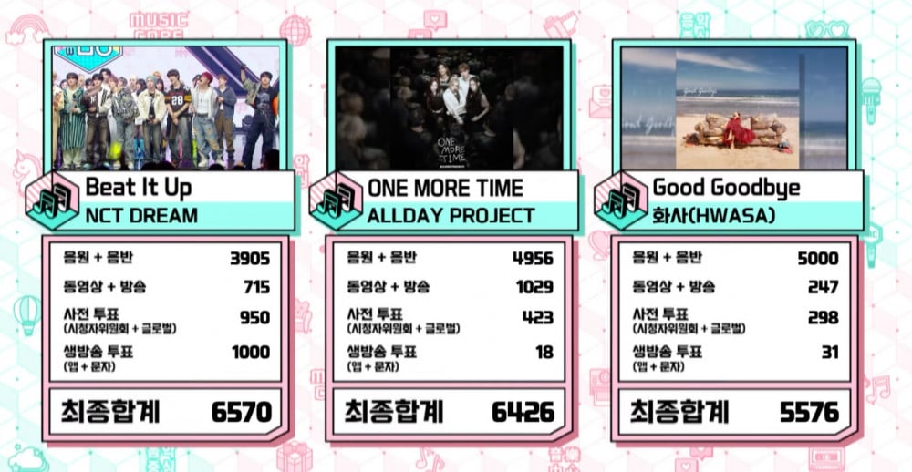 NCT Dream擊敗強勁對手ALLDAY PROJECT與華莎奪冠。他們的新曲《Beat It Up》在直播投票環節獲得驚人的1,000分,最終以總分6,570分成績勝出。