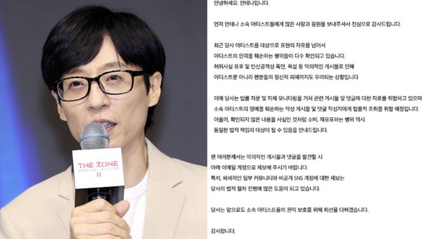 Antenna宣布對針對旗下藝人包括劉在錫的惡意評論採取法律行動